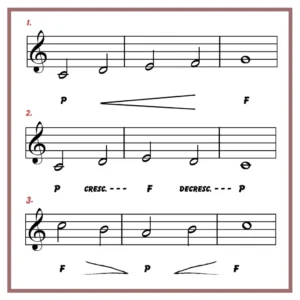 Now the second exercise, start singing the note C with a piano (softly). Now gradually increase the volume from the second note (D) with a crescendo and sing the note F with a Forte (loudly).